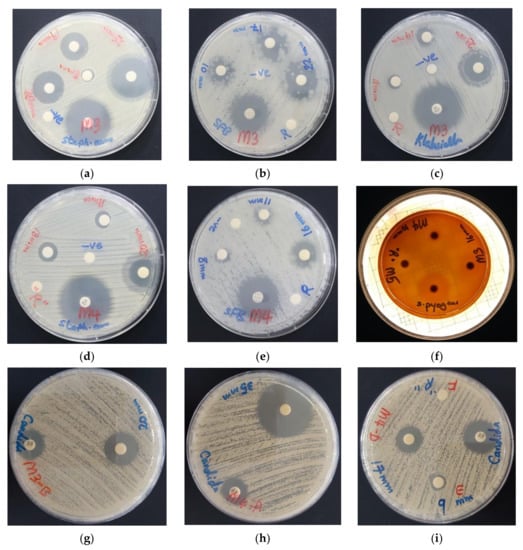 Antimicrobial disc dilution assay of biocomplexes with positive controls (antibiotic). From left to right: AV-PVP-I2 against (a) S. aureus ATCC 25923; (b) P. aeruginosa WDCM 00026; (c) B. subtilis WDCM 00003. From (d,e): AV-PVP-I2-NaI against (d) S. aureus ATCC 25932; (e) B. subtilis WDCM 00003; (f) AV-PVP-I2, AV-PVP-NaI and AV-PVP-NaI against S. pyogenes ATCC 19615. From (g–i): Susceptibility of C. albicans WDCM 00054 towards (g) AV-PVP-I2 (25 µg/mL); (h) AV-PVP-I2-NaI (50 µg/mL); (i) AV-PVP-I2-NaI (D = 6 µg/mL, E = 3 µg/mL, F = 1.5 µg/mL).