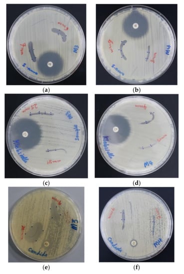 Antimicrobial agar plate methods on dip coated PGA sutures with positive control antibiotics. From left to right: against S. aureus ATCC 25,923 (a) AV-PVP-I2; (b) AV-PVP-I2-NaI; against K. pneumoniae WDCM 00097 (c) AV-PVP-I2; (d) AV-PVP-I2-NaI; against C. albicans WDCM 00054 (e) AV-PVP-I2; (f) AV-PVP-I2-NaI.