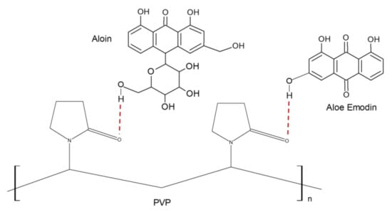 The size of the complexes increases, starting with AV-PVP-I2-Na as the smallest composite, followed by AV-PVP-I2 and finally AV-PVP-NaI as the biggest complex compound (Figure 4c). The main components of AV are available in AV-PVP-I2 and AV-PVP-I2-Na around 290 and 360 nm compared to previously reported data (Figure 4c) [,]. According to Moulay [], two absorption bands of PVP-I2 at 305 and 380 nm indicate the adherence of iodine to amorphous regions.