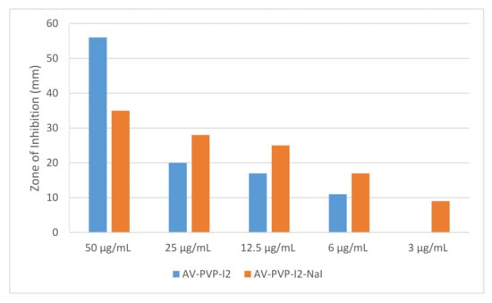The zone of inhibition plate method was used to test the antimicrobial activities of AV-PVP-I2 and AV-PVP-I2-NaI against the selected pathogens []. The bacterial strains were first suspended in 10 mL MHB and incubated at 37 °C for 2–4 h, while C. albicans WDCM 00054 was incubated on Sabouraud Dextrose broth at 30 °C. Disposable, sterilized Petri dishes with MHA were evenly seeded with microbial culture of 100 μL adjusted to 0.5 McFarland standard applied with sterile cotton swabs, dried for 10 min and used for the antimicrobial testing.