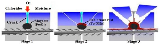 Economically, the serviceability of building materials is of great importance, especially in contemporary infrastructures and constituent parts. In the context of urban development, the most commonly employed concrete materials have to comply with the requirements of the standard codes of practice with regard to strength and durability [,,,]. For instance, the serviceability of the concrete material in use can be reduced by factors such as suboptimal planning, low capacity or overload, flaws in the material design and structures, incorrect building practices or substandard maintenance as well as the lack of knowledge about engineering [,]. The concrete structures used in construction industries require an extra improvement because they deteriorate rapidly during the lifespan. This deterioration is due to a range of both extrinsic and intrinsic processes related to the chemical, physical, thermal, and biological nature [,]. Furthermore, the impact of inadequate use and environmental conditions on how concrete performs has been highlighted in many studies [,,,]. Within construction industries, the prevention of the steel reinforcement exposure to hazardous chemicals such as corrosive agents depends significantly on the concrete. In general, the steel reinforcement becomes exposed to corrosion as a result of crack formation in the concrete, enabling harsh chemicals (e.g., chloride) to penetrate and reach the steel reinforcement bar. After reacting with water and oxygen these chemicals produce corrosion []. Figure 1 illustrates a basic representation of the occurrence of corrosion in reinforced concrete.