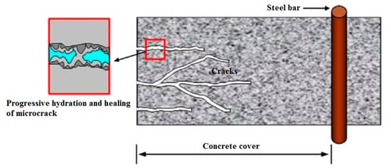 Human settlements are dependent on infrastructure systems (e.g., buildings, transport, energy, water, communication) to mediate a wide range of human activities. []. Globally, infrastructure made of concrete (e.g., bridges, buildings, wharves, etc.) is susceptible to deterioration due to the ever-increasing carbon dioxide levels, temperature, and relative humidity []. Concrete is primarily made up of cement, the production of which has major implications for the climate change, especially as it appears that the demand for cement is relentless. The durability and lifespan of concrete structures under different weather conditions are influenced greatly by the high sensitivity of the cement materials to harsh environmental conditions that can cause concrete expansion and eventual cracking [,]. In turn, severe structural issues can arise from the concrete cracking. Thus, exceptionally durable smart concrete based on self-repair technology has been developed in response to the ever-greater specifications regarding the durability that must be satisfied by these concrete structures [].