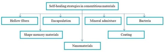 In the human body, skin and tissues are capable of repairing themselves through replacements of damaged areas based on nutrient uptake. Similarly, the essential products that serve as nutrients in the cement-based materials with self-repair capability may enable these materials to repair the damage or deterioration (Figure 3). Ample research has been conducted in recent times to discover new methods for achieving an effective self-repair material alongside the durability of the cement-based materials. Figure 4 illustrates an overview of such methods.