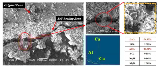 It was demonstrated that the geo-polymer was formed due to the addition of the geo-material with a content of 71.3% SiO2 and 15.4% Al2O3 to the expansive material through a separate polymerization of the aluminate and silicate complexes []. The presence of alkali metals caused the dissolution of the polymerized aluminate and silicate complexes at the alkaline pH. As uncovered by an extensive examination, the geo-polymer gel particles were less than 2 µm in size and a large number of hydro-garnet or Aft phases were produced by cracked interfacial phases associated with the original ruptured zone (Figure 5). In comparison to the hydro-garnet phase, the dense phase contained most of the altered geo-polymer gel as revealed by the Energy Dispersive X-Ray Analyzer (EDX) spectra. According to additional analysis of the chemical additives, an improvement was achieved by supplementing regular concrete enclosing the NaHCO3, Na2CO3, and Li2CO3. Such composition triggered the cementitious re-crystallization and concrete particle precipitation []. The conclusion reached was that crack self-repair could be greatly enhanced through the addition of sufficient quantities of carbonates and expansive agents.