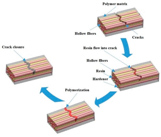 Self-repair is made possible by the hollow fibers as illustrated in Figure 6. These fibers use voids constituting a composite network matrix for the storage of certain functional constituents of the materials serving as repair agents [,]. When extrinsic stresses or stimuli cause concrete structure deterioration and crack formation, the functional constituents are released from the voids in which they are stored to automatically heal damage. Thus, these hollow fibers work akin to arteries in a living organism, making it possible for the materials in which they are embedded to repair themselves [,]. For example, the self-repair of polymeric composites is facilitated by bulk polymers [,,,]. The technique of damage visual enhancement was devised by Pang and Bond [] for the rapid and straightforward detection of the internal damage in the composite structures. Evidence has been provided that the progress of the healing process can be monitored via the fibers containing engineering healing materials and labelled with the fluorescent dye.