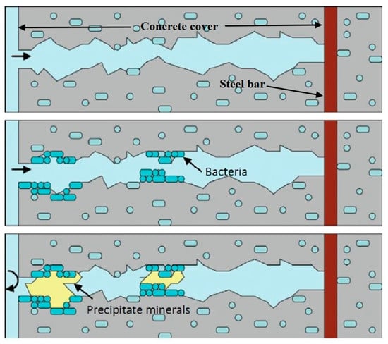 Typical crack-healing processes via immobilized bacteria in concretes [].