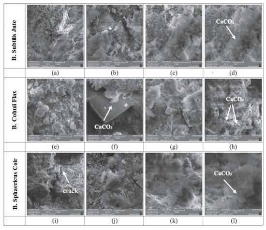 Figure 9 shows the microstructure of three selected concrete specimens incorporated with the bacteria and natural fibers (B. subtilis with jute (Figure 9a–d), B. cohnii with flax (Figure 9e–h), and B. sphaericus with coir fibers (Figure 9i–l)). As a carrier, the flax fibers provided a better protection to the bacteria, indicating an efficient crack-healing and pore-filling ability. Zhu et al. [] developed some sustainable engineered cementitious composites (ECCs) by incorporating limestone calcined clay cement and polypropylene fibers. The results showed that the proposed concrete can attain an efficient recovery of the composite tensile ductility and ultimate tensile strength through the self-healing mechanism. It was established that the inclusion of fibers in the self-healing concrete matrix can positively affect the mechanical properties and self-healing efficiency of the studied concretes.