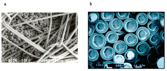 Phase change microcapsule applied onto textile as a coating (a), magnification 200×. Phase change material incorporated into the core of a fibre (b), magnification 600×. Source: Outlast Technologies.