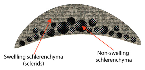 Stylised representation of pinecone bract cross section illustrating the location and distribution of the two types of schlerenchyma fibre.