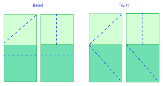 Microfibril orientation is a significant and general factor in hygronastic behaviour. For instance, it controls the dehiscence (splitting) of the two halves (valves) of the legume pod. At maturity and in dry conditions, the valves split along a seam to expose the seeds. Depending on the legume species, the valves split either by bending outwards or twisting around their individual axes. This reversible motion (the valves return to their original form when exposed to moisture) is managed by the orientation of cellulose microfibrils within the valve cell walls. This configuration is abstracted as two separate adjoining layers, such as a bimetallic strip. Bending occurs when the cellulose microfibrils are orientated at right angles to each other, while twisting is caused by two possible configurations—first, the microfibril orientation is at 45° to the valve axis and the others are orientated in parallel, and the second consists of fibrils at 45° to the valve axis and those in the adjoining layer are positioned in reflection symmetry [19]. Figure 4 provides a conceptual model summarizing the relationship between cellulose microfibril orientation and observed hygronastic movement.