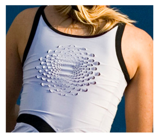 On the basis of this published work, Nike (sportswear brand) independently developed this bilayer principle as a double-jersey textile structure; a knitted fabric made using a machine that features a double set of needles to produce two parallel layers of fabric joined by interlocking stitches. The active textile system was implemented in terms of yarn fibre composition. The face (top, outward facing layer) of the textile used yarns containing hydrophobic polyester fibres. The second layer, or back of the textile, was composed of yarns containing fibres made from hydrophilic polyamide. The polyamide fibres expand when damp [24]. The resulting system was implemented in a tennis dress. Scales, similar to the U-shaped flaps in the pinecone effect textile, were introduced at the back of the dress; the resulting technology was marketed under the trade name Macro React (Figure 6).