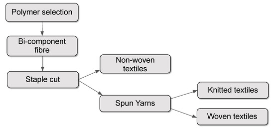 The application of the hygronastic model at the yarn-scale demonstrated the desired functionality; however, the chemistry and yarn morphology were deemed unsuitable for commercial application. Although the chemistry could have been developed into a combination suitable for garment use, the overall design and size of the monofilament yarn was not appropriate for application in industrial textile production systems. Although the pursuit of commercially viable chemistry for this specific iteration was of little value, the application of the active mechanism into the basic building block of commercial textiles, a fibre, informed the next iteration. An active fibre would enable the application of the hygronastic mechanism across a broader scope of textile structures as indicated in Figure 11. In fibre form, the active mechanism can be implemented into knitted and woven textiles via yarns and directly into non-woven textiles; however, the reverse is not possible—i.e., the implementation of the mechanism at textile scale into yarn or fibre.