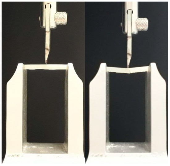 Each sample was positioned inside an aluminum support having a distance of 21 mm between the two arms. A universal testing machine (Model 3343, Instron Corporation, Canton, MA, USA) was used to apply a compressive load on the middle of the specimens with a crosshead speed of 1.0 mm per minute until the failure (Figure 1) [30]. Flexural strength (σ) and elastic modulus (E) were calculated as follows [31]: