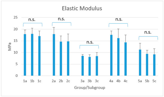 Mean elastic modulus (MPa) for each group/subgroup. Legend: 1: x-tra fil; 2: GrandioSO x-tra; 3: Admira Fusion x-tra; 4: VisCalor bulk; 5: Enamel Plus HRi. Subgroups A (1a–5a): 4-week storage in 50 mL distilled water (control subgroups); Subgroups B (1b–5b): 3-week storage in 50 mL distilled water + 1-week storage in 50 mL soft drink; Subgroups C (1c–5c): 4-week storage in 50 mL soft drink. n.s.; non-significant; The Kruskal–Wallis method showed significant differences among groups (p < 0.0001). Post-hoc showed that the highest elastic modulus was reported for groups 1, 2, and 4, with no statistical difference neither among the corresponding subgroups (p > 0.05) nor among the three subgroups of each material (p > 0.05). Values reported for groups 3 and 5 were significantly lower (p < 0.05) but, even this time, without significant differences neither among the corresponding subgroups, nor among the three subgroups of the two materials (p > 0.05). Finally, the values of subgroups 4c and 5a showed no statistical difference among them (p > 0.05).