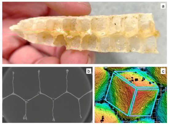 Silicone molding was used to obtain additional information on the nature of the interface between the honeybee comb cell arrays. A portion was cut out from a comb (Figure 9a) and secured in a soap dish-sized container. Smooth-On Dragon Skin 10 SLOW, a high-performance platinum slow cure pourable silicone rubber was poured over the section due to its ability to capture detail while remaining very strong and stretchy when cured. The material properties of the silicone rubber allow the final cured mold form, shown in Figure 9b, to be flexible without deformation or tearing while examining the interface, surfaces along the crevasses, and other hard to see areas. This mold was then scanned with the previously mentioned structured white light scanning microscope, to obtain height data as shown in Figure 9c. The aim of using this approach was to complement the limited data obtained from X-ray tomography and also have a physical replica of the negative space inside the bee’s honeycomb.