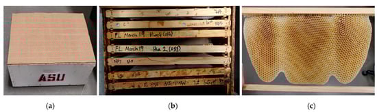 Honeybee comb was specially obtained for this study, curated at the Bee Lab on the Mesa campus of Arizona State University. The Italian subspecies of the European honeybee, Apis mellifera ligustica (hereafter A. mellifera) was the species selected for this study. Comb was built in 2 weeks during the period of March–April 2019. Fifteen individual combs from six colonies were created by bees in open frames lacking plastic or wax foundation typically used by beekeepers to more accurately mimic conditions the bees would experience in the wild (Figure 5a,b). This enables a more accurate representation of how these structures are made under natural conditions. The data collected here are on a range of specimens pulled from these honeybee comb—additionally, all reported data are from freshly built comb, since it was collected within 3 weeks of construction. The material composition of comb changes over time as the material of construction transitions from mostly beeswax to a composite of beeswax and silk from spent cocoons [].