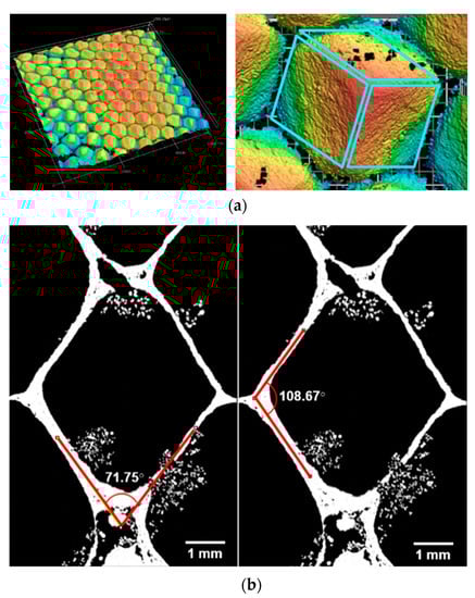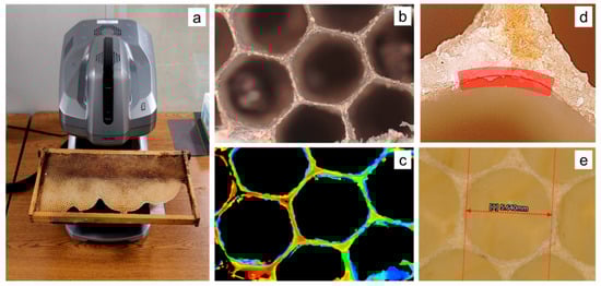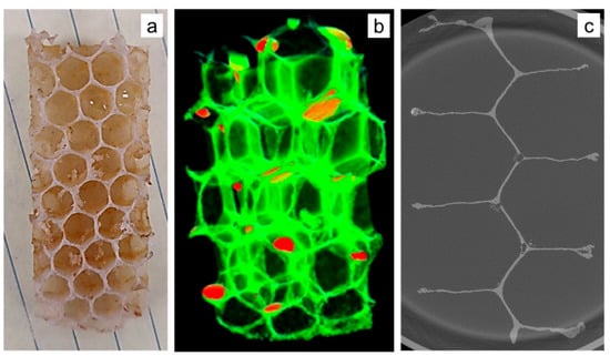 The scanned sample consisted of a structure made of beeswax, with some residual honey. The reconstructed data set was rendered in 3D (Figure 8b) and resliced, such as Figure 8c. Measurements were made along the cell wall using Image software []. Coping is clearly visible and formed the basis for closer observation and measurement. Coping is also the reason why the walls look thicker when viewed from above (Figure 8a), as opposed to by the cross-section (Figure 8c).