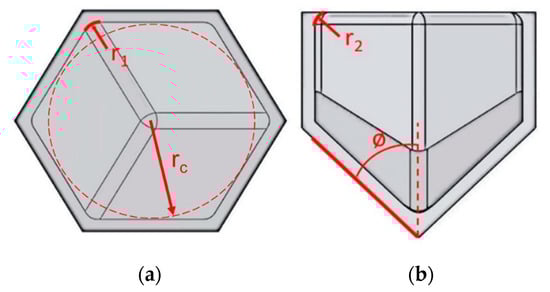 The objective of the design step is to create specimens for testing that reflect a range of values associated with the parameters of interest. All design work for this study was conducted using the SolidWorks 2019 CAD design software []. The first step was to create a hexagonal unit cell that embodies the three parameters of interest, as shown in Figure 10. A unit cell with 1 mm thick walls and an 8 mm cell diameter was selected, based on manufacturability assessments to ensure walls were printed with sufficient fidelity and that trapped powder could be adequately removed, and also to ensure that at least 10 cells were present in each direction to minimize size effects []. Each of the three parameters was designed following observations of biological comb structure (discussed in Section 3.1). The corner radius (r1) is shown in Figure 10a and is essentially a fillet radius around the corners of the hexagon. The coping was idealized as a fillet radius (r2) as well, as shown in Figure 10b; although this does not exactly capture the matchstick like dome at the top of the coping, it accounts for the addition of mass at the very top in a manner that is feasible to model and manufacture to designed intent. Finally, the interface was designed with variable angle ϕ, as shown in Figure 10b.