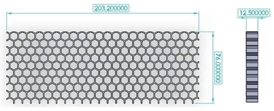 The outer dimensions of the specimens, shown in Figure 12, were selected based on guidelines in the MIL-STD-401, a general standard provided for test methods for sandwich core materials []. This does result in a fairly thin specimen, especially for the cases with interfaces, but does enable comparisons within the range of specimens studied and also against commercial honeycomb core. Three different categories of specimens were created, for three test conditions: out-of-plane compression, in-plane compression, and three-point bending. For each specimen design, the three design parameters were varied as shown in Table 1, along with a baseline honeycomb core with no corner filleting, coping, or interface (the conventional honeycomb with no interface has a 0° interface angle). This resulted in a total of 64 specimens per test condition or a total of 192 unique designs. A few representative design files are available in the Supplementary Materials.