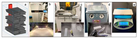 Selective laser sintering (SLS) process flow used in this study: (a) part layout in the powder bed, (b) fabrication on the EOS Formiga P110 machine, (c) part removal from the powder cake, (d) trapped powder removal with bead blasting, and (e) part weighed prior to testing.