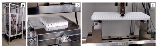 Two types of tests were conducted in this study, all on an Instron 5985 electromechanical testing system, shown in Figure 14a. The tests selected for this study were out-of-plane compression (Figure 14b) and three-point bending (Figure 14c). Out-of-plane compression test conditions including strain rates were taken from MIL-STD-401 []. Since these materials can be significantly strain rate sensitive even at relatively low strain rates [], only one strain rate was examined for each test condition. ASTM D790 [] was referenced for flexural strain rates for three-point bend testing as well as equations for calculating flexural properties. Compression testing was conducted in order to calculate elastic modulus, first maximum stress, and energy absorption. Three-point testing was conducted to calculate maximum load and flexural rigidity.