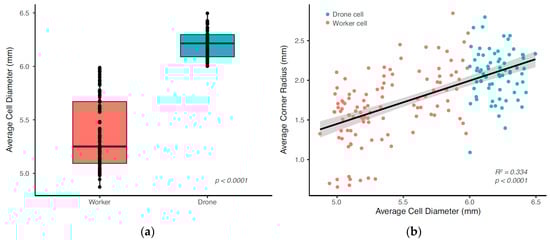 (a) Average cell diameter for drone and worker cells from six natural A. mellifera comb and (b) average corner radius against cell diameter for the same comb.