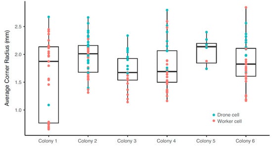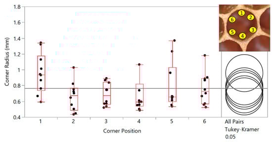 Corner radii by position (shown in inset) shows no statistically significant differences in values (data from one natural A. mellifera comb). Variances are equal by Brown–Forsythe test.
