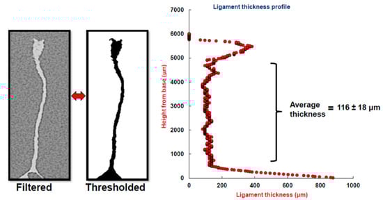 Figure 19 shows a 2D cross-section of a ligament from the base region at the bottom to the coping region on top. The thickness of the wall is fairly uniform from the base region that connects to the interface, right up to the beginning of the bulbous coping region, after which thickness increases rapidly, growing about 5–7-fold at its peak. The coping region is concentrated in a small but significant portion of the wall and, as with the corner radius discussed previously, involves the additional allocation of beeswax material. For seven walls studied, the average wall thickness underneath the coping region was found to be 116 ± 18 µm.