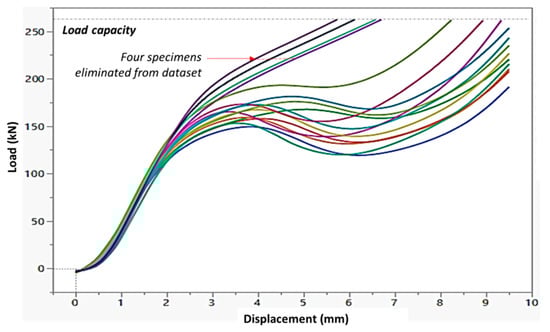 Out-of-plane test output data for manufactured honeycomb in raw load-displacement format showing typical response for specimens tested—four of these specimens exceeded load capacity without any significant data collection and were excluded from subsequent analysis.
