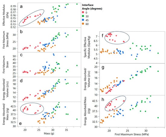 For the out-of-plane compression test, key metrics of interest are the compressive modulus, the first maximum stress and strain, and the energy absorbed. As shown in Figure 22, all of these metrics generally show an increasing trend with increasing mass. In fact, it is the honeycomb without an interface (i.e., an interface angle of zero) that stands out from the rest, showing higher effective modulus and energy absorption per unit mass, as shown in the encircled regions of Figure 22a. A key design objective for energy absorption is maximizing energy absorbed per unit mass and volume, for a given maximum transmitted stress [,]. The graphs in Figure 22b show that the presence of an interface negatively impacts energy absorption per unit mass in this regard. Normalization with regard to mass also enables comparison to other commercial and published honeycomb core data, e.g., the specific energy absorption (SEA) for natural fiber based honeycomb core materials has been shown to be between 0.4 and 1.5 J/g over a relative density range of 0.1–0.4 [], which is significantly lower than the SEA reported here with additively manufactured nylon 12. Aluminum honeycomb core has been reported as having SEA of between 1 and 5 J/g [] and independently between 5 and 15 J/g []. The nylon 12 SEA values reported here are between 30 and 45 J/g, which suggests that these materials and designs are promising candidates as energy absorbers. These graphs also make it clear that the biggest modulator of mechanical behavior among the parameters and levels studied is the interface angle and that the presence of the interface only serves to reduce the SEA for a given maximum transmitted stress.