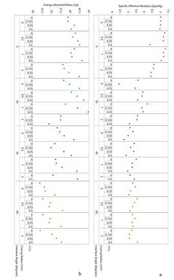 Examining the variability charts in Figure 23, it is clear that the specific effective modulus for a given interface angle shows a mild inverse trend with corner radii and is generally unaffected by coping, as shown in Figure 23a. Energy absorption per unit mass, as shown in Figure 23b, is also not only significantly impacted by coping but also shows a stronger and direct relationship to corner radii.