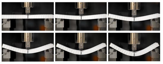 where F is the maximum load measured during the test; m is the slope of the initial portion of the load-deflection curve; and L, b, and d are dimensional metrics, representing the span length, the width, and the thickness of the specimen, respectively. A typical bending test progressed as shown in Figure 24 and was carried out till either the specimen had fractured or had gone past its point of peak load.