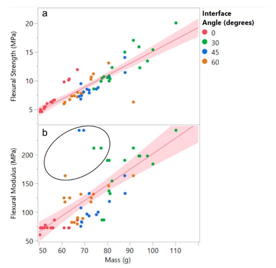 A total of 62 specimens were tested using this method, each representing a different combination of interface angle, coping radius, and corner radius. The flexural strength and modulus results for these 62 specimens are plotted with respect to measured mass in Figure 25, color coded by the interface angle, with 0° once again representing the baseline honeycomb without any interface. Unsurprisingly, both metrics have a direct relationship with mass of the specimen. Although flexural strength does not reveal any deviations from this relationship (Figure 25a), the flexural modulus does show a few results that significantly improve on the overall trend, as encircled in Figure 25b, all for honeycomb structures with interfaces.