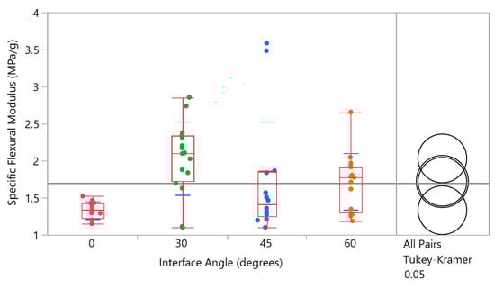 Specific flexural modulus as a function of interface angle (includes results from different coping and corner radii) showing the 30° interface to be statistically better than the baseline 0° (i.e., no interface) for manufactured honeycomb. Variances are equal by Brown–Forsythe test.