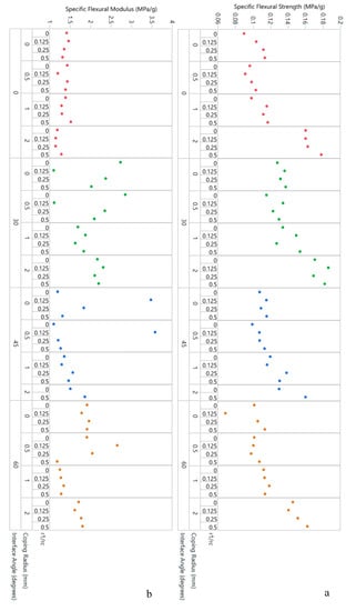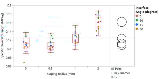 Finally, the trends in specific flexural strength and specific flexural modulus as a function of the three design variables can be studied in the variability chart in Figure 27. For specific flexural strength, Figure 27a shows that interface angle does not impact results much. For any given interface angle, however, the data suggest that specific flexural strength increases with increasing coping radius—as shown in Figure 28, this effect is quite significant with differences evident every 1 mm. For specific flexural modulus, plotted in Figure 27b, the first remarkable observation is how little the baseline result is affected by any of the design parameters. Here too, it is clear that interface angles do increase specific flexural modulus, with the 30° angle showing the highest values on average.