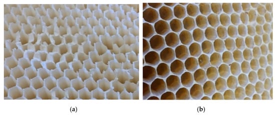 The selection of test methods was driven primarily from engineering requirements specified for honeycomb core and less informed by the true functional loading seen by the honeybee’s comb. Additionally, the mechanical behavior of polyamide nylon 12 used in this study is quite different from beeswax. As a result, no strong claims are made on explaining natural honeycomb structure as a result of this study. However, while the primary functional purpose of the honeybee’s comb is storage of brood, honey, and pollen, it nonetheless has to be structurally robust enough to survive one or more seasons in its environment []. It may be reasonably argued that the honeybee’s comb design is not optimized for out-of-plane compression, e.g., since that condition does not occur in the honeybee comb environment nor does it experience the large strains in this study. However, this is a common test condition in characterizing honeycomb core and is hence included here in the study. From a structural standpoint, honeybee comb needs to retain integrity under self-weight loading conditions, which is an in-plane loading condition []. Additionally, the honeybee’s comb needs to handle wind loads that could impose bending loads on it, on which the 3-point bend test may provide useful insights into. In this context, the corner radius may delay the onset of nonlinear yielding behaviors, and increase bending strength, consistent with what was found experimentally in this work. Finally, the role of coping may also be to prevent fraying of the thin honeycomb walls. Figure 29 demonstrates man-made and natural honeycomb, both made with beeswax, after some months of handling and storage. The engineered honeycomb (Figure 29a) clearly shows signs of walls fraying, while the natural honeycomb does not. This damage tolerance is most likely enabled by the coping, and is another reason why these structures matter.