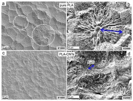 - CNTs increased the crystallinity of the PLA and modified the resultant morphology. Both pure PLA and PLA-CNT crystallized under α and α’ forms. However, SEM showed pure PLA crystallized as large, well-developed spherulites, while PLA-CNT nanocomposites displayed higher spherulite densities with smaller, more irregular spherulites. CNTs act as nucleating agent, increasing the crystallinity of PLA; however, did not impact the glass transition temperature (Tg).