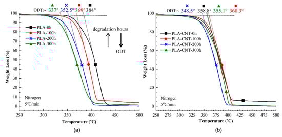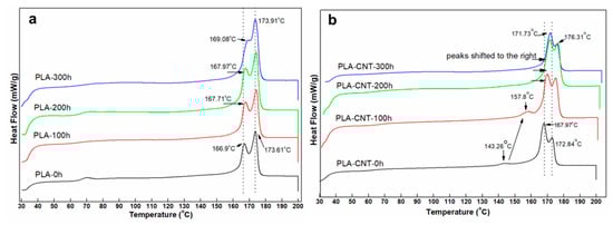 - At the beginning of the weathering test, the Tg increased, but as the degradation proceeded, Tg decreased, most likely due to the reduction of molecular weight from chain scission. The degree of crystallinity of pure PLA was found to significantly increase during the degradation. The spherulites formed in the PLA-CNT nanocomposites were slightly more thermally stable as indicated by the onset melting temperature.