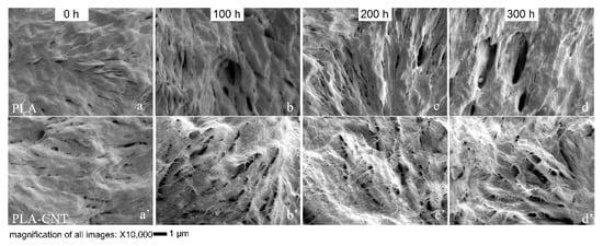 - The PLA-CNT nanocomposites degraded slowly compared to the pure PLA as observed by the slower void formation rate, lower decomposition temperature reduction, and the preservation in mechanical properties. Morphometric analysis showed fewer and smaller voids on the PLA-CNT nanocomposite film which would limit the penetration of water molecules into the depth of the film.