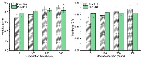 - Up to 300 h of degradation, both modulus (E) and hardness (H) of pure PLA gradually increased. It indicates that the material became brittle which is due to the chain scissions and chemi-crystallization caused by degradation. On the other hand, E and H of PLA-CNT did not significantly change which is contributed to the influence of CNTs which act as a stabilizer and retain initial nanomechanical properties of PLA-CNT nanocomposites samples.