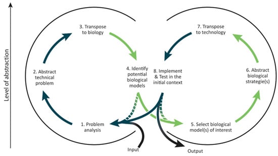 Thus, a great number of processes have been designed to help implement a technology pull approach, e.g., the procedural model of doing bionics [12], biomimetic design methodology [13], problem-driven analogical process [14], etc. Through a comparative analysis of these processes, Fayemi synthesized eight main steps representing an overall description of the technology pull biomimetic process [15]. Figure 1 presents the resulting process that will be considered as the process of reference in this article.