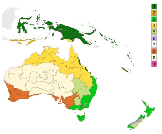 - Terpsichores Australasian Biomes. Available online: https://commons.wikimedia.org/wiki/File:Australasian_biomes.svg (accessed on 6 March 2020).