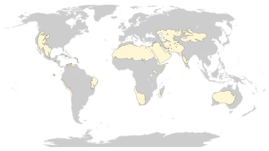 - Terpsichores Deserts and Xeric Shrublands. Available online: https://commons.wikimedia.org/wiki/File:Biome_map_13.svg (accessed on 6 March 2020).