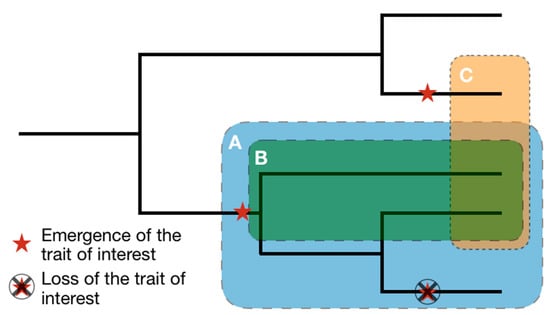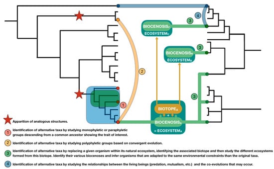The integration of horizontal biologists is recognized to be of great potential all along the process but more specifically during the biology-centered steps (steps 3–5) [68]. During those steps, they may help design teams to enter biology, explore the biological diversity, select pertinent models and properly transfer this information to the rest of the team [7,8,10,70]. However, even if they are described in terms of potential contributions, objectives, and involvement steps, the literature doesn’t properly prescribe how will they be able to reach those objectives. For example, Yen stated that “advanced students (in biology) may even learn to find relevant examples based on phylogenetic relatedness” [10], already pointing out the potentialities of phylogenetics presented in this article but without further information. Therefore, they remain ill-defined regarding their practice, skills, and field of expertise. The main reason explaining that situation is that steps 3–5 have no direct equivalent in biology. Thus, conceptual bridges need to be formalized to allow a proper adaptation of biological practices, tools, and reasoning to biomimetics.