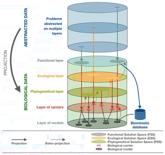 Facing this new definition, the underlying cognitive process can also be better understood. The 3rd step is thus performed through the projection of abstracted problems into biology to identified biological embodiments of the abstracted problems. These embodiments are then mapping problem spaces within biology. Thus, in those spaces, biological organisms are facing problems analogous to the ones faced in our technical model. Taking the side of these organisms, problem spaces represent solution spaces. The choice of using the concept of solution space over problem space is to focus on the idea that those spaces are encompassing numerous, sometimes highly diverse, solutions for a given combination of problems. The 4th step will then lead biomimetic teams to search and identify models within these solution spaces. Solution spaces thus form a map delimiting the scopes of high potentialities from those that may be less relevant.