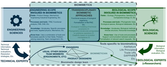 Facing the observation made in this section, determining which part of biology, and so which biological fields, to integrate in the context of biomimetics would naturally bring answers on the characterization of this new profile’s know-how, knowledge, practices, and tools (Figure 2).
