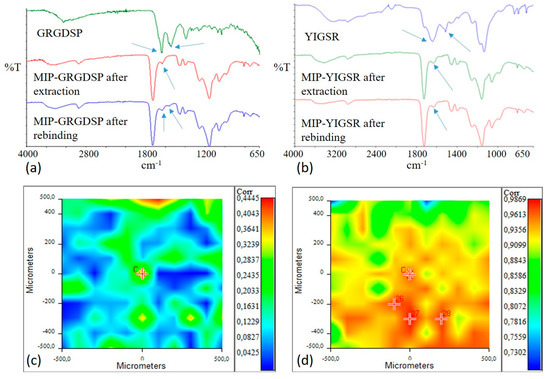 Infrared spectra of: (a) GRGDSP peptide, MIP-GRGDSP after extraction, and MIP-GRGDSP after rebinding; (b) YIGSR, MIP-YIGSR after extraction, and MIP-YIGSR after rebinding. Amide I and Amide II adsorption bands are indicated by arrows. Correlation maps with YIGSR spectrum for MIP-YIGSR after extraction (c) and MIP-YIGSR after rebinding (d). Colors in correlation maps correspond to correlation values (from red, higher values, to blue, lower values), as reported in the bars on the right in figures (c,d).