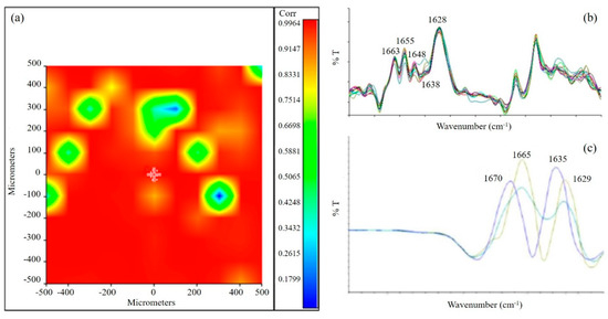 (a) Correlation map between the chemical map and the medium spectrum. The green areas in the correlation map are the pores of the sponge; (b) Second derivative of AGE spectrum; (c) Second derivative of gelatin spectrum.