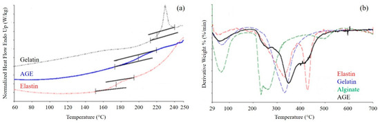 (a) Differential scanning calorimetry (DSC) thermograms of gelatin, elastin, and AGE blend. Inflections in the curves indicate a glass transition event; (b) Derivative curves obtained by thermogravimetric analysis of AGE blend and pure components. Peaks in the curves indicate events of weight loss.