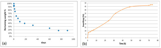 The results of the hydrolytic degradation test are collected in Figure 6a. Weight loss was quite rapid during the first 7 days (45%), which was probably a consequence of the release of not cross-linked material; then, the process proceeded more slowly, with a remaining weight of 18% after 90 days.